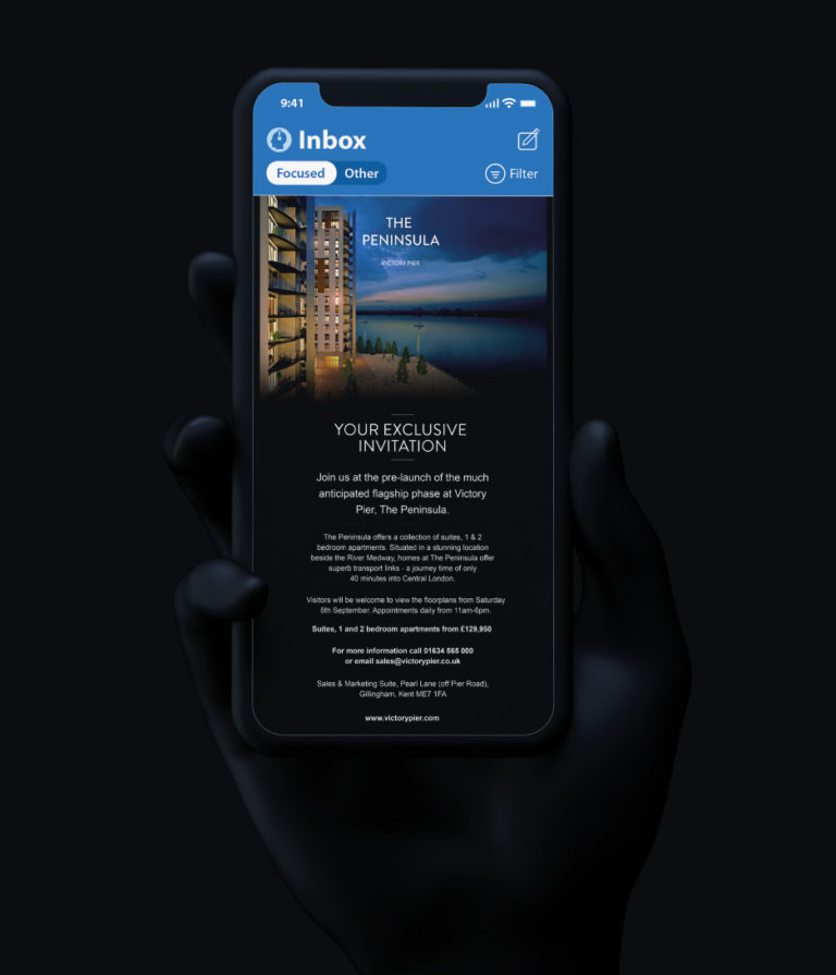 We were first appointed by Berkeley Homes in 2013 to work on the development branding and marketing materials for Victory Pier. Fast forward six years and we’ve completed the fifth brochure and associated deliverables for the final phase of the Medway Waterfront development. Forming part of the Medway Regeneration Masterplan, Victory Pier is a large mixed-use scheme comprising residential apartments, retail and leisure units, student accommodation and a hotel. The development’s waterside location, public open spaces, on-site gyms, and WIFI lounges complemented by the apartment’s specification, good transport links and proximity to 4 university campuses make an attractive proposition to owner occupiers and investors alike.